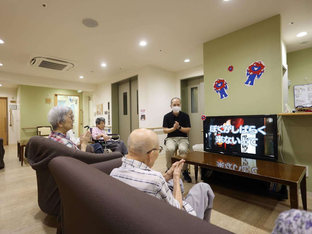 京都の真ん中ですし、京都にちなんだ歌をうたいながら体操をしたり、童謡や歌謡曲を歌いながら楽しみを見つけてもらうことが私の仕事です。声を出して感情を表出することで心のバランスを保てたり、各階のコンパクトなまとまりの中で、体調や顔色を見ながら楽しい時間を作るようにしています。ゆったりした空間ですので、ワンパターンではないこと、非日常的な瞬間もとり入れながら、とにかく楽しんでいただくことですね。